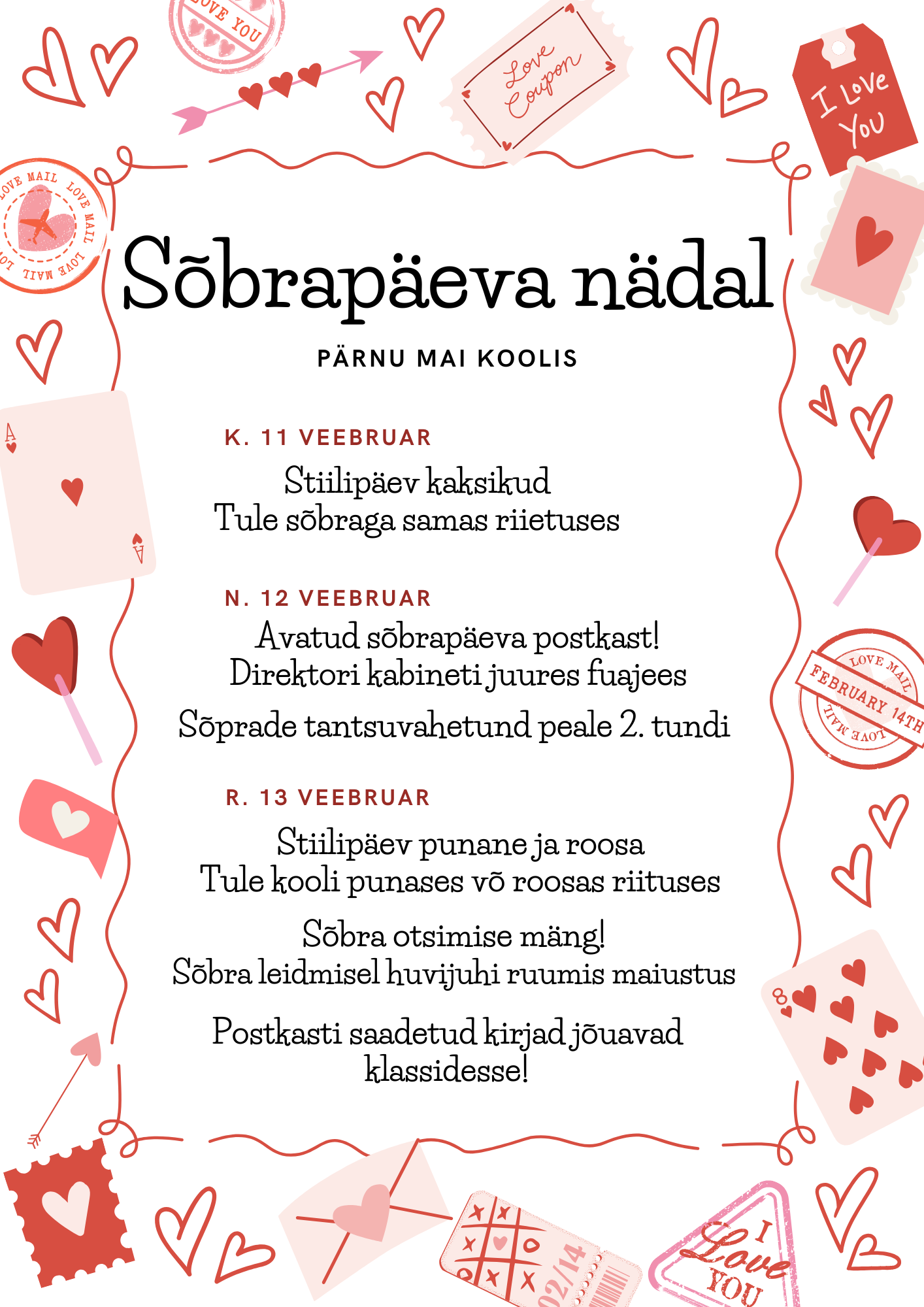 | R. 13 VEEBRUAR | StiilipĂ€ev: punane ja roosa â€ïžđž Tule kooli punases vĂ”i roosas riietuses SĂ”bra otsimise mĂ€ng đ SĂ”bra leidmisel huvijuhi ruumis maiustus đŹ |